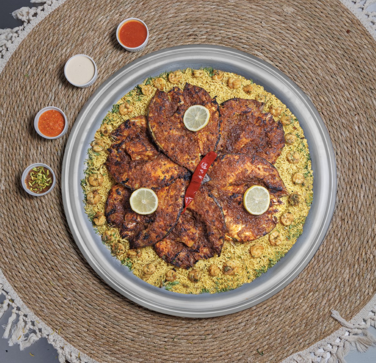 A grand seafood platter made to impress! Six freshly caught Sea Bream, grilled to perfection for a tender, smoky flavor. Served with fluffy shrimp-infused rice and complemented by traditional sides — tangy Mahbuj, zesty Dakous, creamy Tahina, and a sweet touch of Halwa. Perfectly portioned to satisfy gatherings of up to 8 people.
