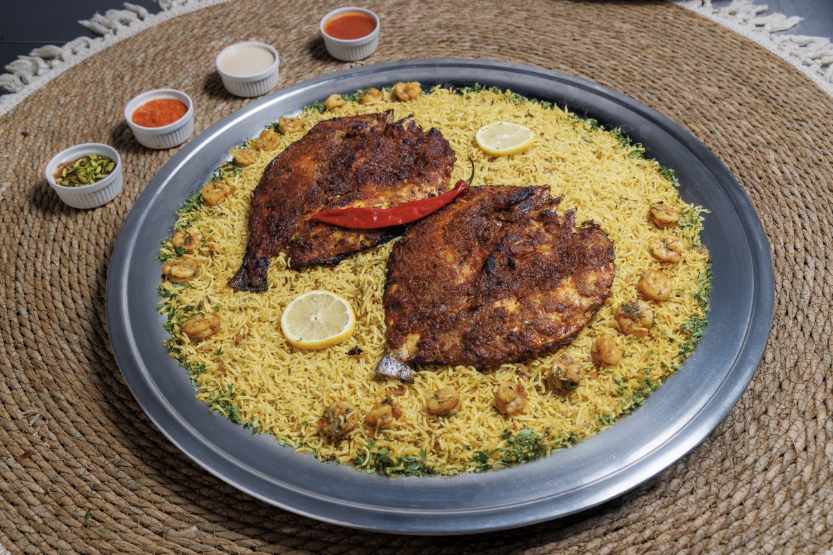 A perfect seafood experience for four! Enjoy two freshly caught Sea Bream, grilled to perfection for a rich, smoky flavor. Served with fluffy rice infused with shrimp and paired with authentic sides — tangy Mahbuj, zesty Dakous, smooth Tahina, and a touch of sweet Halwa.